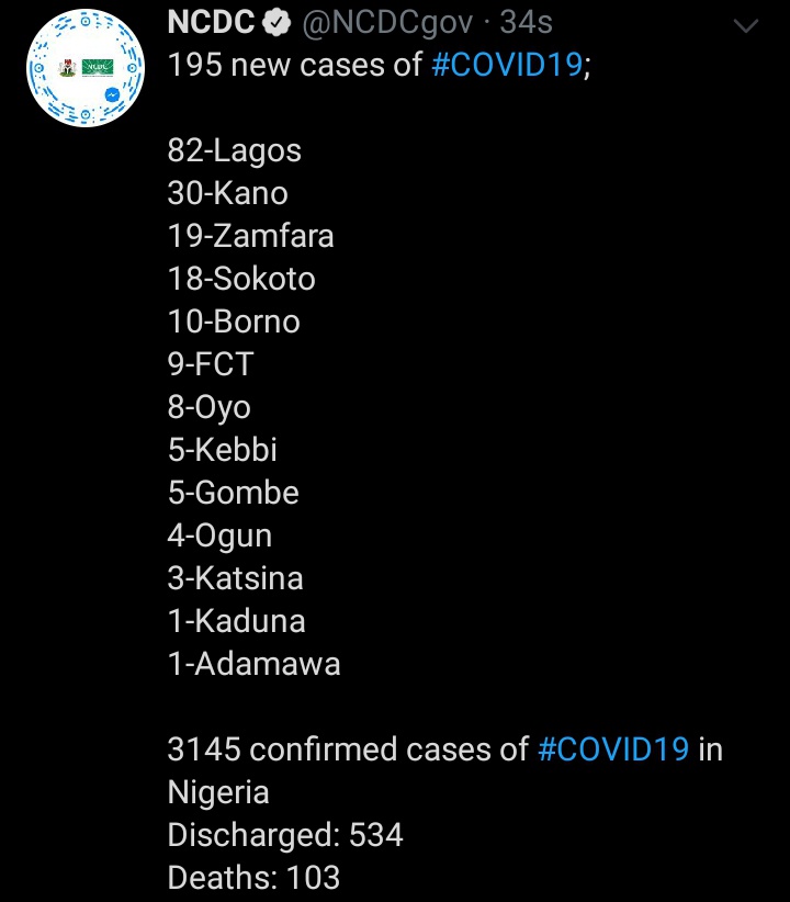 Breaking! NCDC announced 195 new cases of coronavirus in Nigeria as confirmed cases toll hit 3,145 - нσт9נα вℓσg ⏮ ▶ ⏯ ⏭