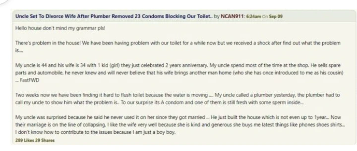 Nigerian man seeks divorce after plumber discovered 26 used condoms inside the toilet - нσт9נα вℓσg ⏮ ▶ ⏯ ⏭