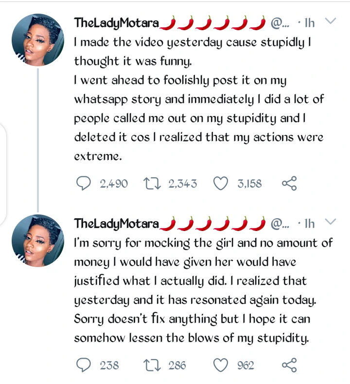 Hours after being dragged by Nigerians for mocking a poor girl, see what she said online - нσт9נα вℓσg ⏮ ▶ ⏯ ⏭